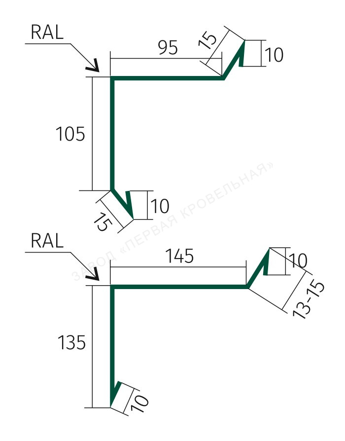 Варианты размеров полки: 135*145 мм; 95*120 мм. Длина: 2 м. Производится в цвет кровли, в том числе, матовый.